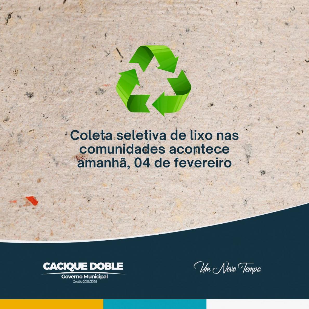 O Governo Municipal de Cacique Doble informa que amanhã, dia 04 de fevereiro, será realizada a coleta seletiva de lixo nas comunidades, seguindo o cronograma habitual de toda primeira terça-feira do mês. A coleta seletiva é fundamental para o descarte correto dos resíduos e a preservação do meio ambiente. A Prefeitura Municipal reforça o pedido para que a população colabore com a separação correta dos materiais, garantindo o sucesso da coleta seletiva e contribuindo para um meio ambiente mais sustentável.