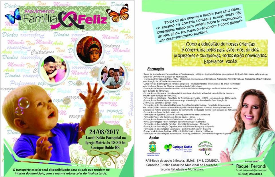 Estará acontecendo nesta quinta-feira, dia 24/08/2017, a partir das 18h30min., no salão Paroquial da Igreja Matriz do município, palestra com a Psicoterapeuta Holístico, Raquel Perondi, com o tema “Movimento Família Feliz”.