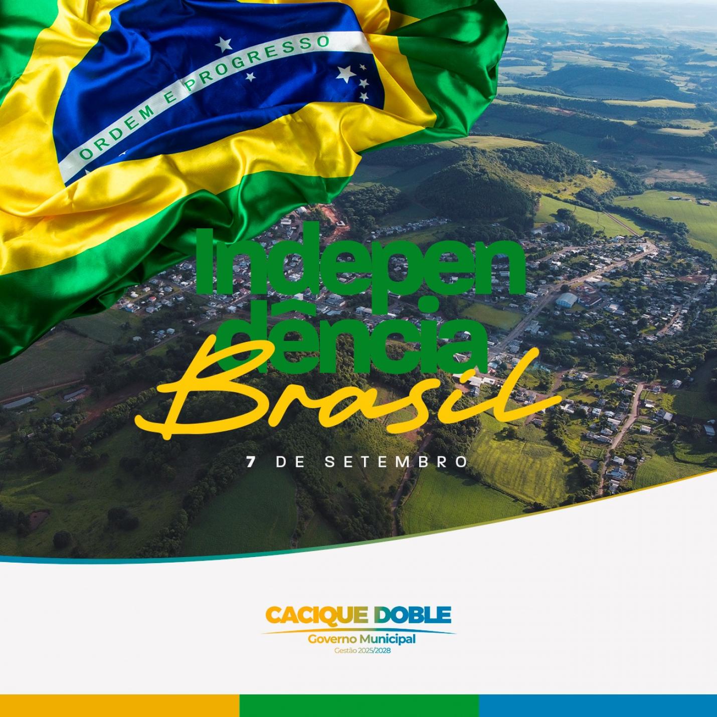 Neste 7 de Setembro, o Governo Municipal de Cacique Doble presta sua homenagem ao Brasil e ao espírito de liberdade, coragem e união que marcam a nossa Independência. Celebramos hoje não apenas um momento histórico, mas o compromisso diário com a construção de uma nação mais justa, democrática e solidária. Que o amor pela pátria continue nos inspirando a trabalhar por uma sociedade melhor para todos. Viva a Independência!