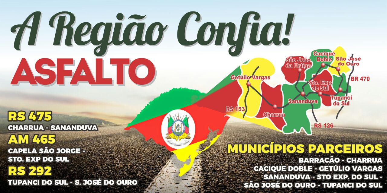 Em reunião realizada no dia 21/11/2017, no restaurante Petiskão, em Cacique Doble a Comissão de Asfalto a “Região Confia”, com a participação de representantes de todos os municípios integrantes da mesma, Charrua, Getúlio Vargas, Sananduva, Santo Expedito do Sul, Cacique Doble, São José do Ouro e Tupanci do Sul, ficou definido o cronograma/calendário de ações a serem desenvolvidas por todos.