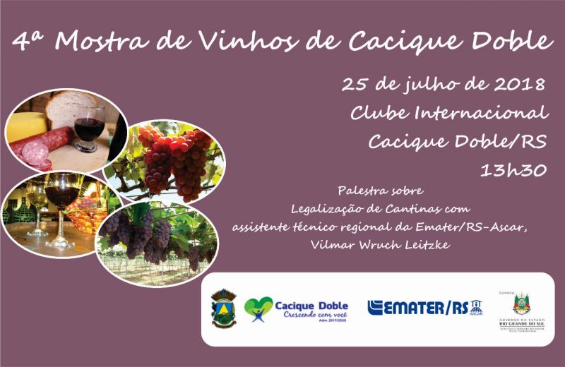 Estará sendo realizada no próximo dia 25/07/2018, a 4ª Edição da Mostra de Vinhos de Cacique Doble, evento este organizado pela Prefeitura, através da Secretaria de Agricultura e escritório Municipal da Emater.