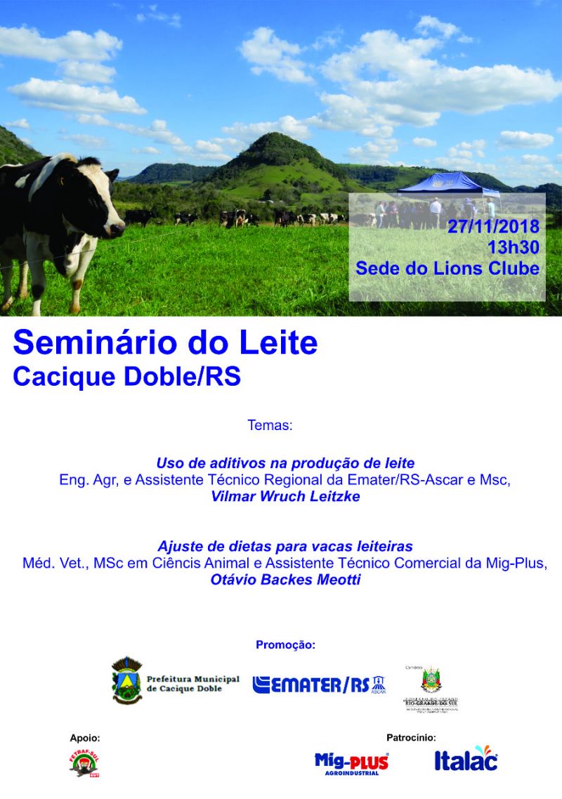 Estará acontecendo no próximo dia 27/11/2018, na sede do Lions Clube, a partir das 13h30min., Seminário do Leite, organizado pela prefeitura de Cacique Doble, através da Secretaria de Agricultura em parceria com o escritório municipal da Emater, com apoio do Sintraf do município.