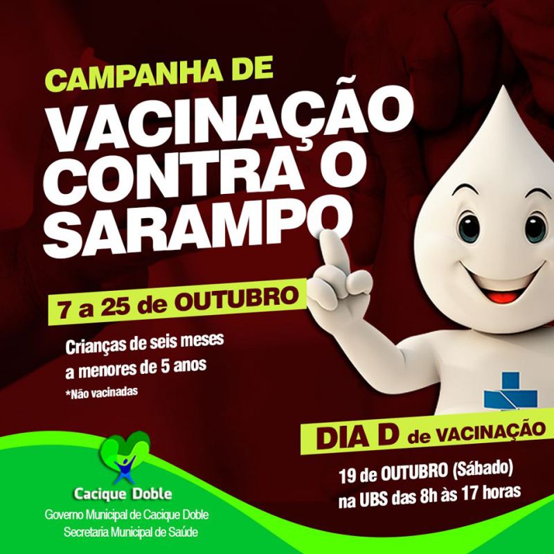 A Coordenação Municipal Epidemiológica de Cacique Doble, através da Enfermeira Dayane Hoffmann, comunica que entre os dias 07 e 25 de outubro acontece a Campanha Nacional contra o Sarampo, e a atualização da caderneta de vacinação é para crianças, não vacinadas, de seis meses a 4 anos, 11 meses e 29 dias. O dia D está marcado para o dia 19 de outubro (sábado) na Unidade Básica de Saúde que ficará aberta das 08 às 17 horas para vacinação. A Secretaria ainda aproveita para solicitar aos pais que levem a caderneta de vacinação de todas as crianças e demais familiares para conferência e atualização da vacina da febre amarela que é de 9 meses a 59 anos além da vacina da tríplice viral correspondente de 6 meses a 49 anos. Esperamos a população para atualização da sua caderneta de vacinação. Secretaria Municipal de Saúde, Governo Municipal.