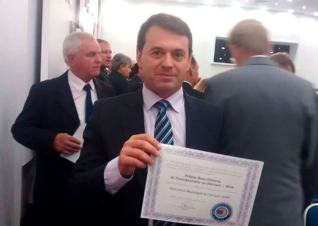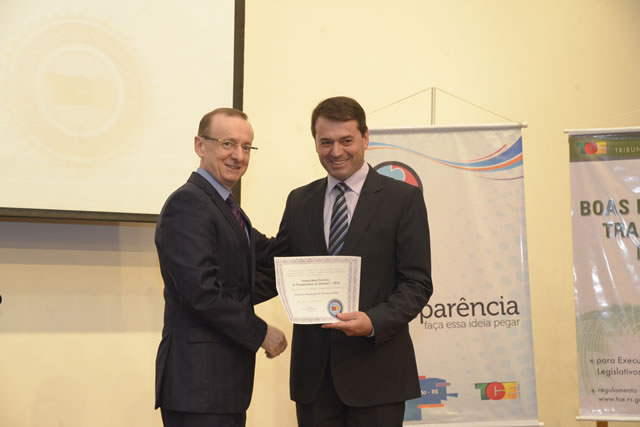 Na tarde de segunda-feira (8), o prefeito Clairton Pasinato recebeu das mãos do presidente do Tribunal de Contas do Estado (TCE-RS), Cezar Miola, o certificado do Prêmio Boas Práticas na Internet. A premiação foi conferida nas categorias abaixo e acima de 10 mil habitantes e consiste em reconhecer através de um diploma de menção honrosa e em um selo digital os sites que atenderam ao disposto pela Lei Complementar nº 131 e pela Lei de Acesso à Informação (LAI).