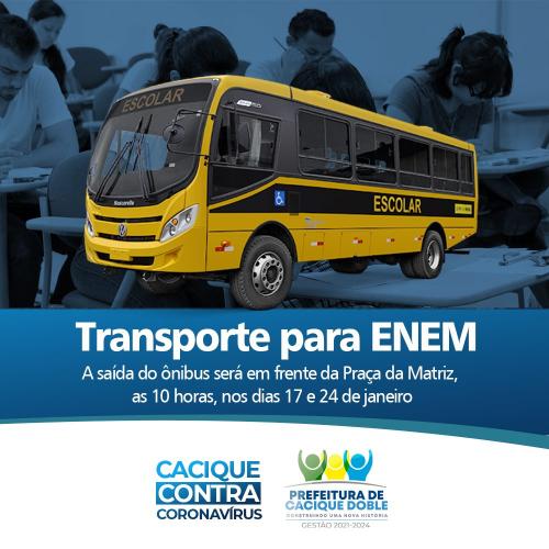 O Governo Municipal disponibilizará Transporte Coletivo gratuito para alunos irem e voltarem dos locais de prova do ENEM (Machadinho), prevista para ocorrer nos dias 17 e 24 de janeiro.