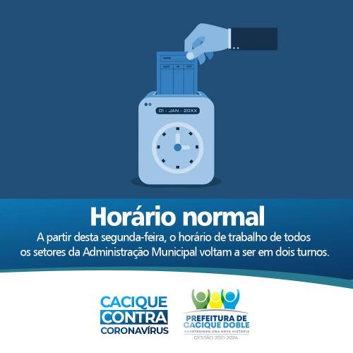 Encerrado o período do turno único, o horário de trabalho dos servidores públicos municipais na Prefeitura será normal de segunda à sexta-feira, entre 8h às 11h30 no período da manhã e entre 13h30 e 17h na parte da tarde.