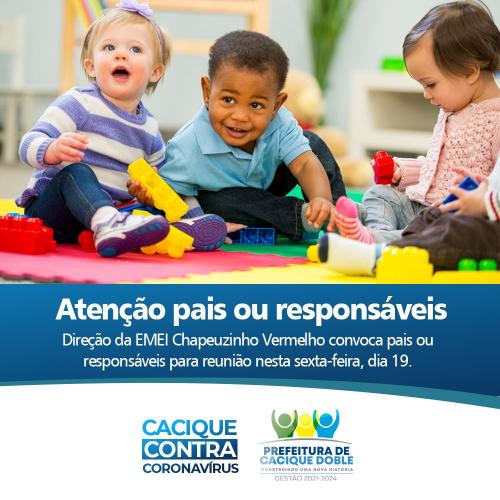 A pouco menos de 15 dias do retorno previsto para as aulas, a direção da EMEI Chapeuzinho Vermelho convoca pais e responsáveis pelos alunos matriculados (somente nesta escola) para uma reunião, na próxima sexta-feira (19).