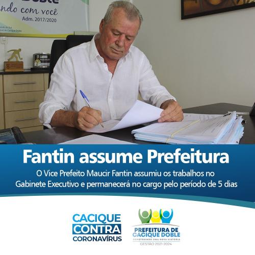 O vice-prefeito , Maucir Fantin, assumiu o comando da Prefeitura Municipal de Cacique Doble, nesta quarta-feira (10). A transmissão de posse ocorreu automaticamente em razão do falecimento do pai do Prefeito Municipal Luiz Ângelo Deon. Fantin permanecerá 5 dias a frente do Executivo Municipal.