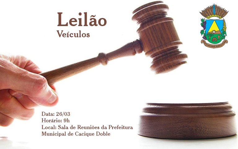 A Prefeitura de Cacique Doble, vai promover leilão de veículos, no dia 26 de março, às 9horas, na sala de reuniões da prefeitura municipal.