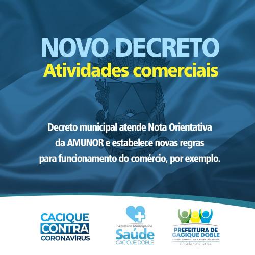 Conforme Nota Orientativa da Associação dos Municípios do Nordeste Rio-Grandense (AMUNOR), a Prefeitura de Cacique Doble editou novo Decreto que estabelece novas normas para funcionamento do comércio.