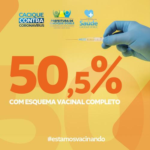 Cacique Doble superou nesta quarta-feira, dia 26 de agosto, o índice de 50% da população vacinada contra a Covid-19 com esquema vacinal completo. O número corresponde a 2557 pessoas, de acordo com os dados do “Vacinômetro”. São 2430 pessoas com a 1ª e 2ª dose e 127 pessoas com a dose única.