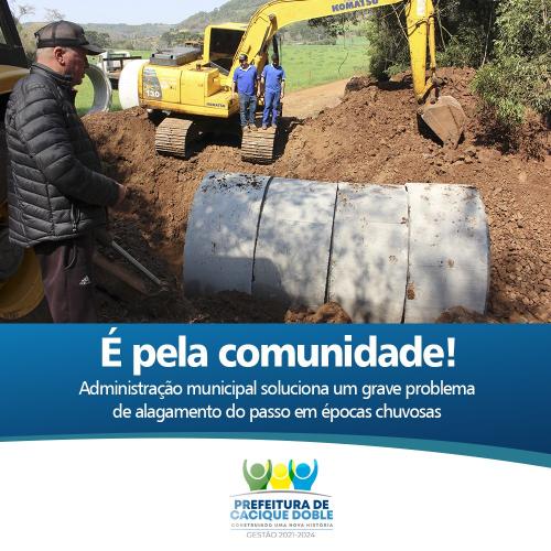 A Secretaria de Obras concluiu nesta quinta-feira, dia 19, mais uma obra para toda a comunidade caciquense. Com a instalação de nova tubulação na divisa das comunidades de São Joãozinho e Santa Terezinha, a Administração municipal soluciona um grave problema de alagamento do passo em épocas chuvosas.