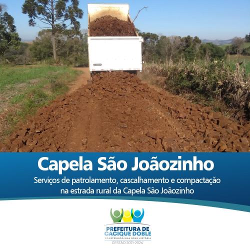 A Secretaria Municipal de Obras continua pondo em prática o Programa "Cacique Doble Bem Cuidada". Nesta sexta-feira, dia 06 de agosto, os trabalhos de patrolamento, cascalhamento e compactação foram realizados na estrada rural da Capela São Joãozinho, mais uma importante via de ligação entre a agricultura e a sede municipal.