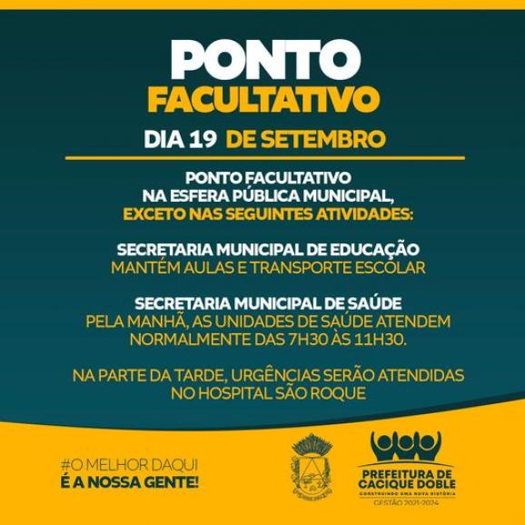O Prefeito Municipal de Cacique Doble, no uso de suas atribuições legais e, considerando que no dia 20 de setembro, é feriado estadual da Revolução Farroupilha (Dia do Gaúcho) e invocando o princípio da economicidade, decretou Ponto Facultativo no dia 19 de setembro de 2022, no âmbito da esfera pública municipal.