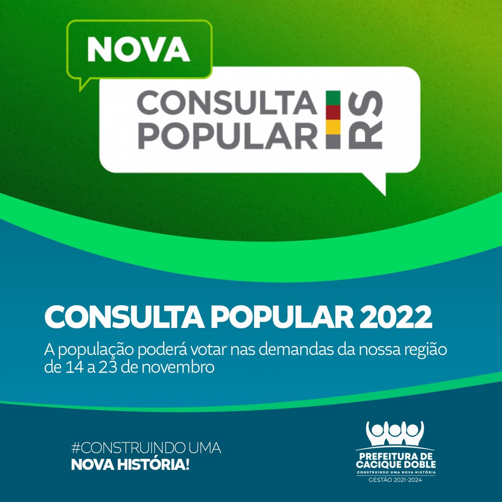 Em 2022, a Consulta Popular ocorre nos dias 14 a 23 de novembro. A votação da Consulta Popular 2022 será on-line. A população poderá votar nas demandas da nossa região através do aplicativo Colab, por meio do site www.consultapopular.rs.gov.br e no Whatsapp (51) 8924-1547 (sem inclusão do 9 na frente do número).