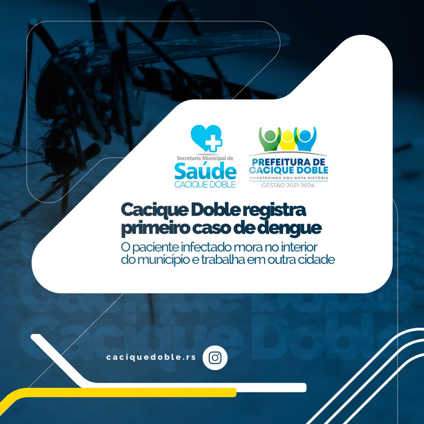 A Prefeitura de Cacique Doble, por meio da Secretaria de Saúde, informa que nesta segunda-feira, dia 24, foi confirmado o primeiro caso de Dengue no município. Trata-se de um paciente, morador do interior do município e que trabalha em Sananduva RS. De acordo com a Vigilância em Saúde, não é possível confirmar se o caso é autóctone, ou seja, se foi contraído no próprio município.
