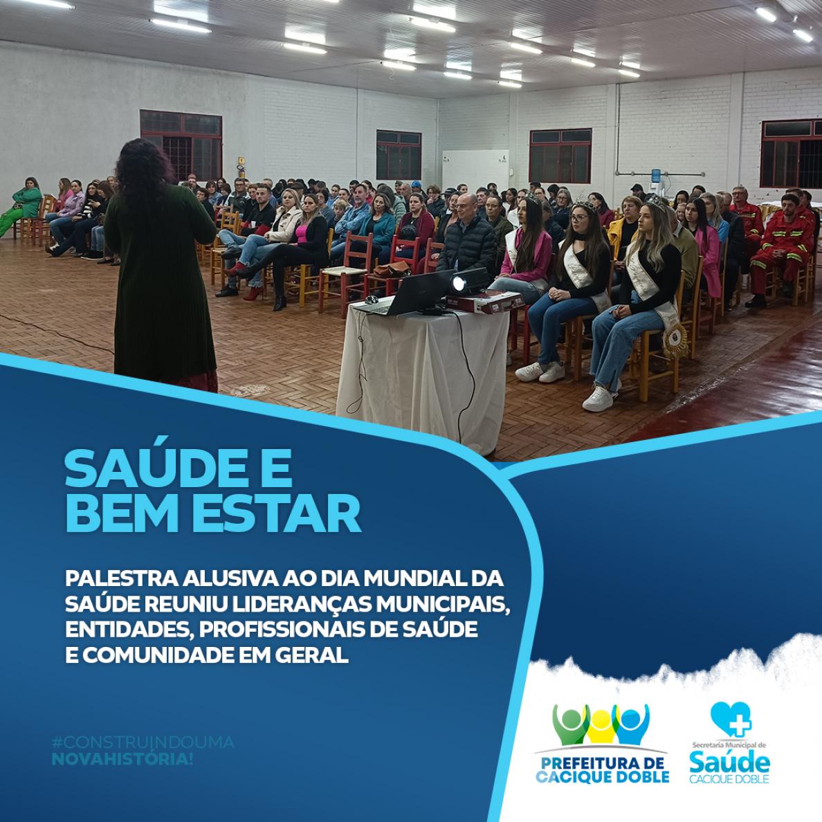 Em comemoração ao Dia Mundial da Saúde, celebrado no dia 7 de abril, a Secretaria Municipal de Saúde, liderada pela Secretária Roselaine de Siqueira Gelain, promoveu a Palestra "Saúde e Bem Estar" com Dr José Alberto da Silva (Cirurgião Geral) e a Terapeuta Transpessoal Márcia Zoppas.