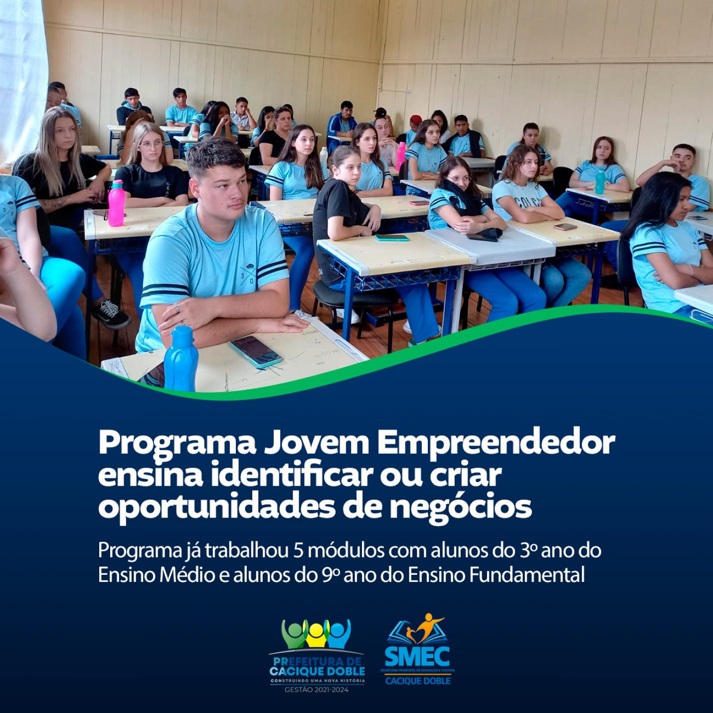 O Programa Jovem Empreendedor instituído pela Administração Municipal, por meio da Secretaria de Educação, envolve alunos do 3º ano do Ensino Médio e alunos do 9º ano do Ensino Fundamental. Durante o programa, o estudante desenvolve habilidades de criação da própria empresa, podendo pesquisar e estudar na área de maior interesse.