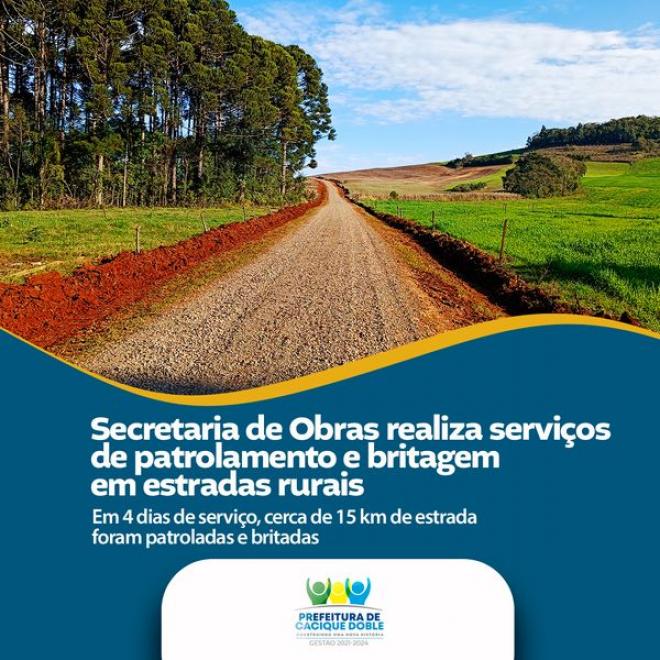 A Secretaria Municipal de Obras realizou manutenção de estrada rural no trecho entre Linha Brasília e a divisa com Santo Expedito do Sul, comunidade de São Miguel. Outros trechos de estradas vicinais, que vão até a comunidade do Caravággio (Santo Expedito do Sul), receberam patrolamento e britagem.