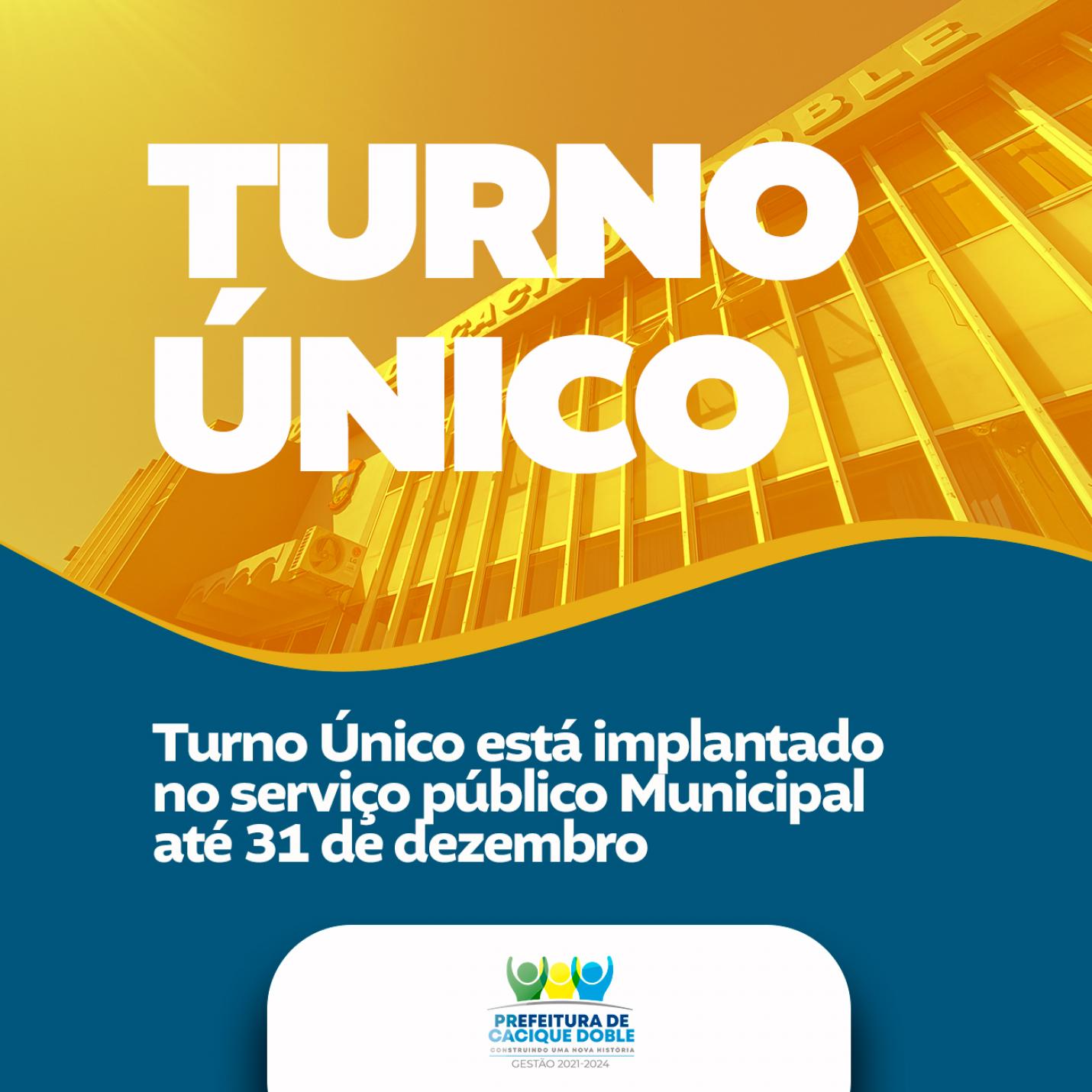 O Turno Único iniciou neste dia 1º de outubro de 2023 e perdurará até 31 de dezembro de 2023, com horário de atendimento das 07h às 13h, nas Secretarias Municipais de Obras, Agricultura, Serviços Urbanos, Assistência Social, Fazenda e Administração e no Gabinete do Executivo Municipal.