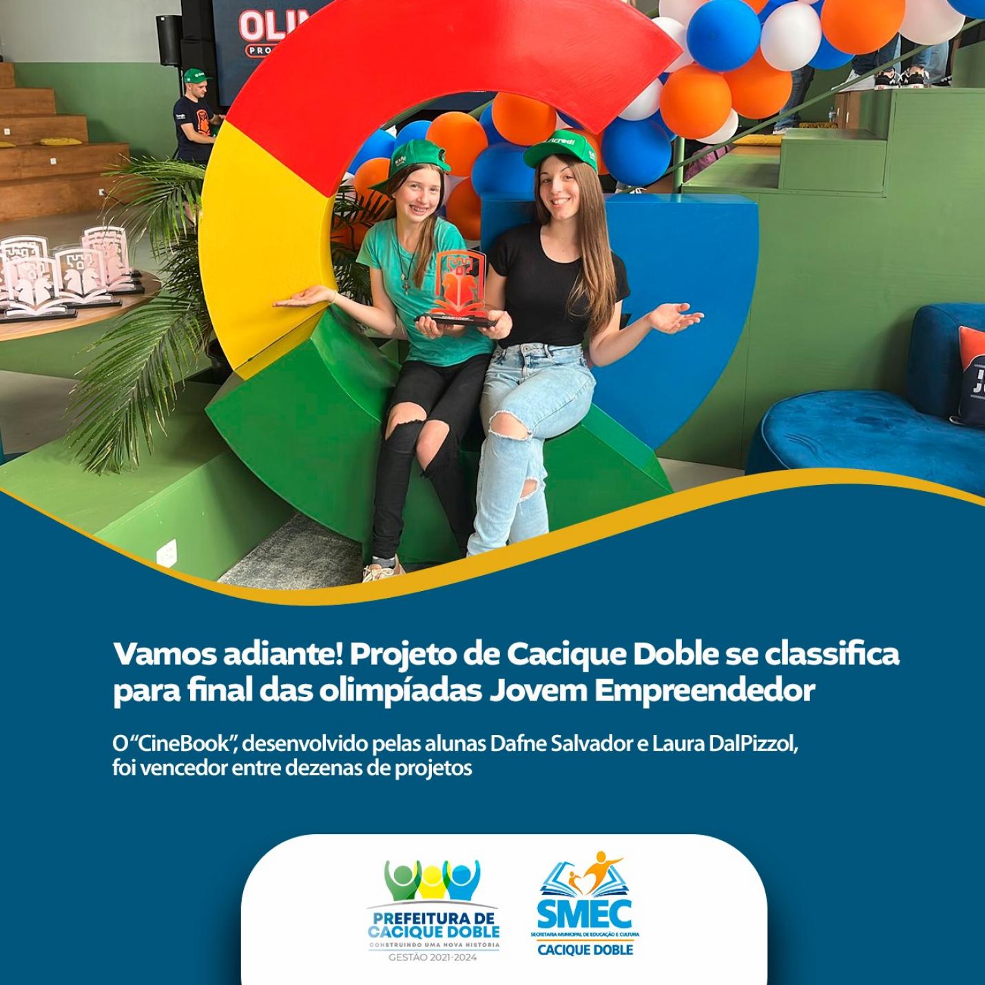 Três projetos de Cacique Doble foram apresentados nas Olimpíadas do Programa Jovem Empreendedor, fase regional, em Passo Fundo. Um deles, o “CineBook”, desenvolvido pelas alunas Dafne Salvador e Laura DalPizzol, foi vencedor entre dezenas de projetos e será o representante na fase Estadual que será realizado no dia 13 de Novembro.