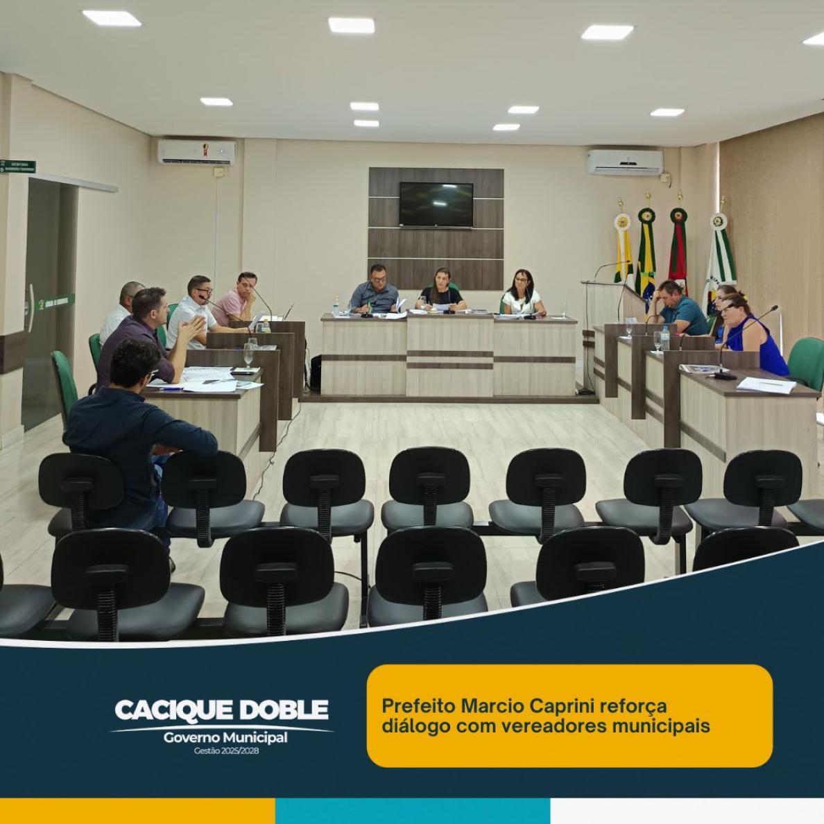 No final da tarde dessa segunda-feira, 27 de janeiro, o prefeito de Cacique Doble, Marcio Caprini, esteve reunido com os vereadores do município em um encontro que reafirmou o compromisso com o diálogo permanente entre os poderes Executivo e Legislativo. A reunião teve como principal objetivo explicar os projetos de lei enviados para apreciação na Sessão Extraordinária, destacando a importância de cada proposta para o desenvolvimento do município.